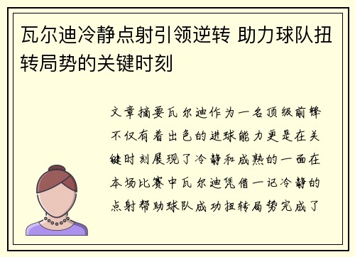 瓦尔迪冷静点射引领逆转 助力球队扭转局势的关键时刻